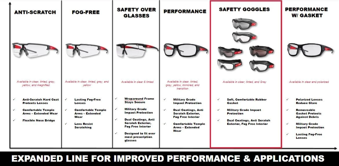 New to Eyewear Lineup Milwaukee Safety Goggles, transition lens, mirrored lens and over the glass glasses